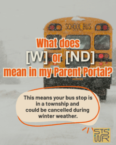 Some bus stops in the Parent Portal have a [W] or [ND] beside them.That tag tells you that your bus stop is in a township (Wilmot, Woolwich, Wellesley, or North Dumfries) Beacause weather in these areas can be more severe than in the city, your bus could be cancelled even if buses in Kitchener, Waterloo, or Cambridge are still running. If you see [W] or [ND], keep an eye on your emails/texts, our website (www.stswr.ca), and social media – you could be afffected by township transportation cancellations! If you do not see these letters next to your stop location, that means your stop is in Kitchener, Waterloo, or Cambridge and is not affected by the township-only cancellations. Check your Parent Portal at www.stswr.ca today so you know what to look for when winter weather arrives! |