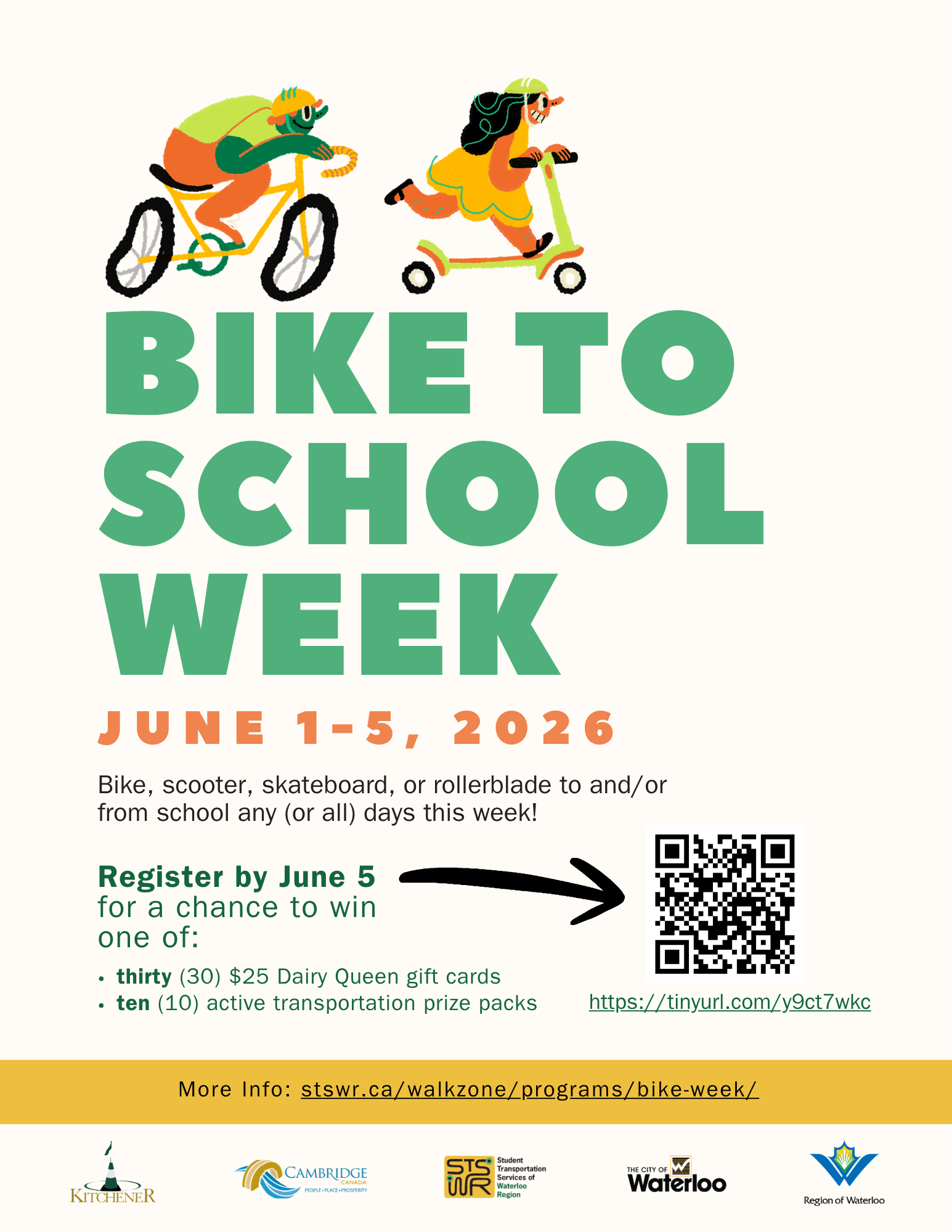 STSWR joins the cities of Cambridge, Kitchener, and Waterloo, and the Region of Waterloo, to encourage more students to participate by sponsoring a host of prizes. This year, there are 30 $25 gift cards to Dairy Queen and 10 active transportation prize packages filled with goodies from the partnership.